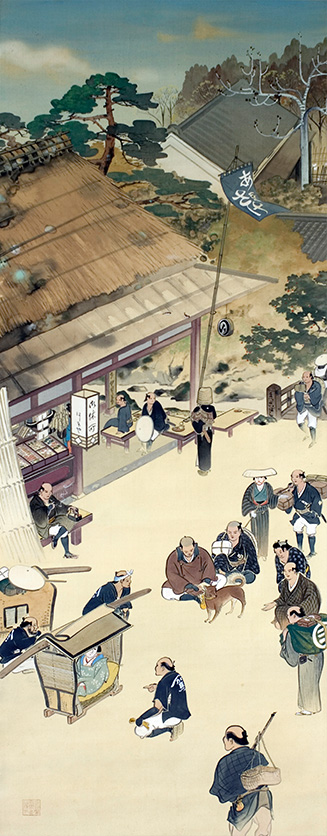 江戸時代後期の琴平には「こんぴら狗」と呼ばれる犬が旅に出られないご主人に代わり「金刀比羅宮」へ代参をしていたそうです。この犬は、旅人や街道・宿場の人々から助けを得ながら、無事に目的地まで辿り着きました。その姿は美しい掛け軸にも描かれ、今でもその物語は語り継がれています。